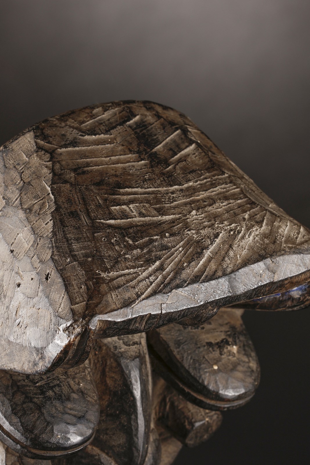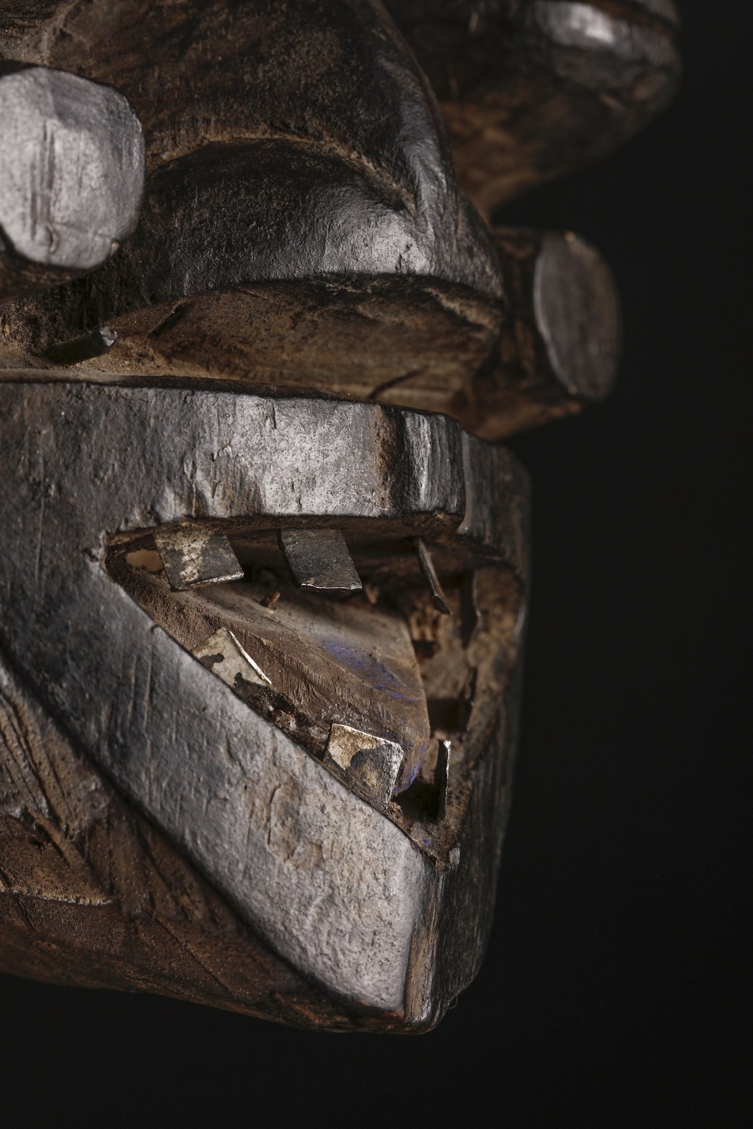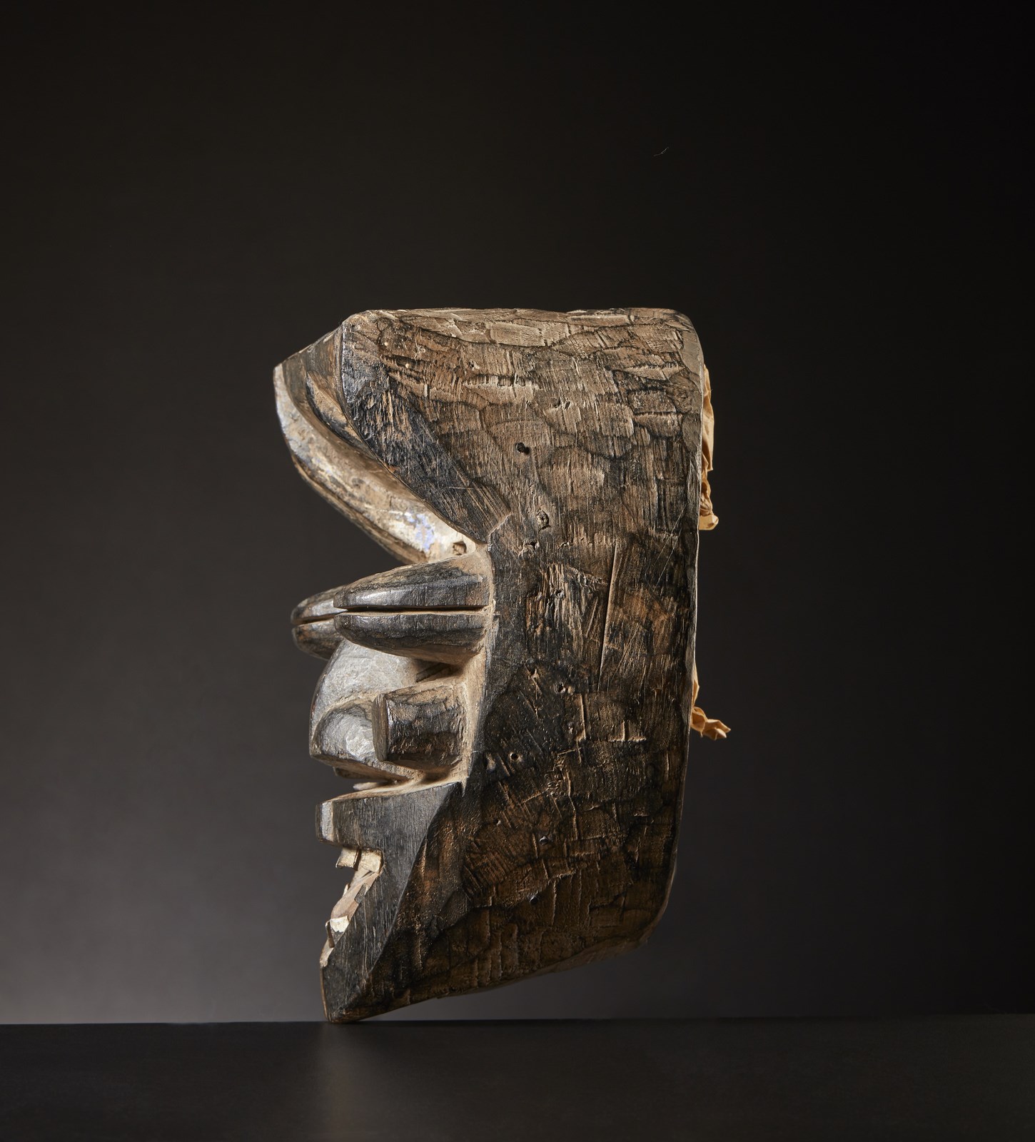 Maschera di grande espressività caratterizzata da occhi a nacchera e corna, naso, gote e bocca prominenti come nello stile tipico dei Guere/We della Costa d'Avorio. La bocca è corredata da denti in metallo e la presenza di chiodi sotto occhi, gote e tutto intorno al perimetro del viso, ci suggeriscono che questa maschera è stata ''vestira'' con tessuti, fibre, peli ed ogni altro materiale che contribuisse ad accrescere il suo potere espressivo e contemporaneamente ad intimorire l'osservatore.Una delle due strette fessure che permettevano al danzatore di vedere è stata volontariamente allargata '' in situ'' e rinforzata al retro per permettere una piu ampia visione. A giudicare dai pochi strati di vernice applicata c'è da supporre che questa maschera sia stata poco utilizzata durante i riti, forse proprio per il problema di ''visibilità'' ed è pertanto da considerarsi giovane, ma la qualità dell'intaglio e la disposizione dei volumi del volto è notevole ( resta grezza solo nel bordo dove da ''vestita'' era ricoperta dai tessuti). La patina nera è stata arricchita e contrastata dal caolino ( ne rimangono tracce) e da poco prezioso pigmento blu.Belle anche al retro, le due etichette quasi oramai illegibili della collezione Raffaele Carrieri che aggiungono storia e fascino a questa ennesima testimonianza della genialità creativa dell'arte africana.