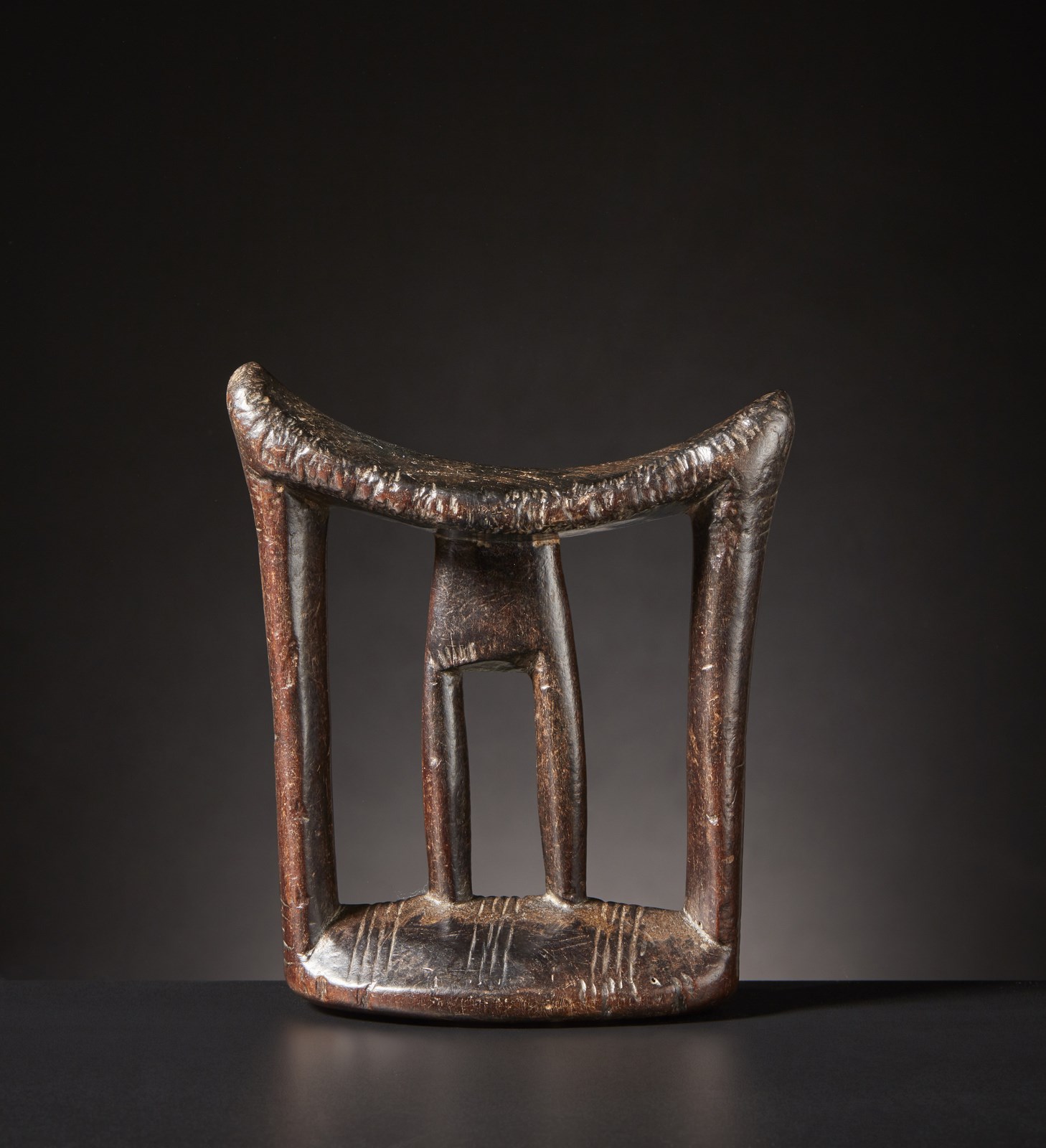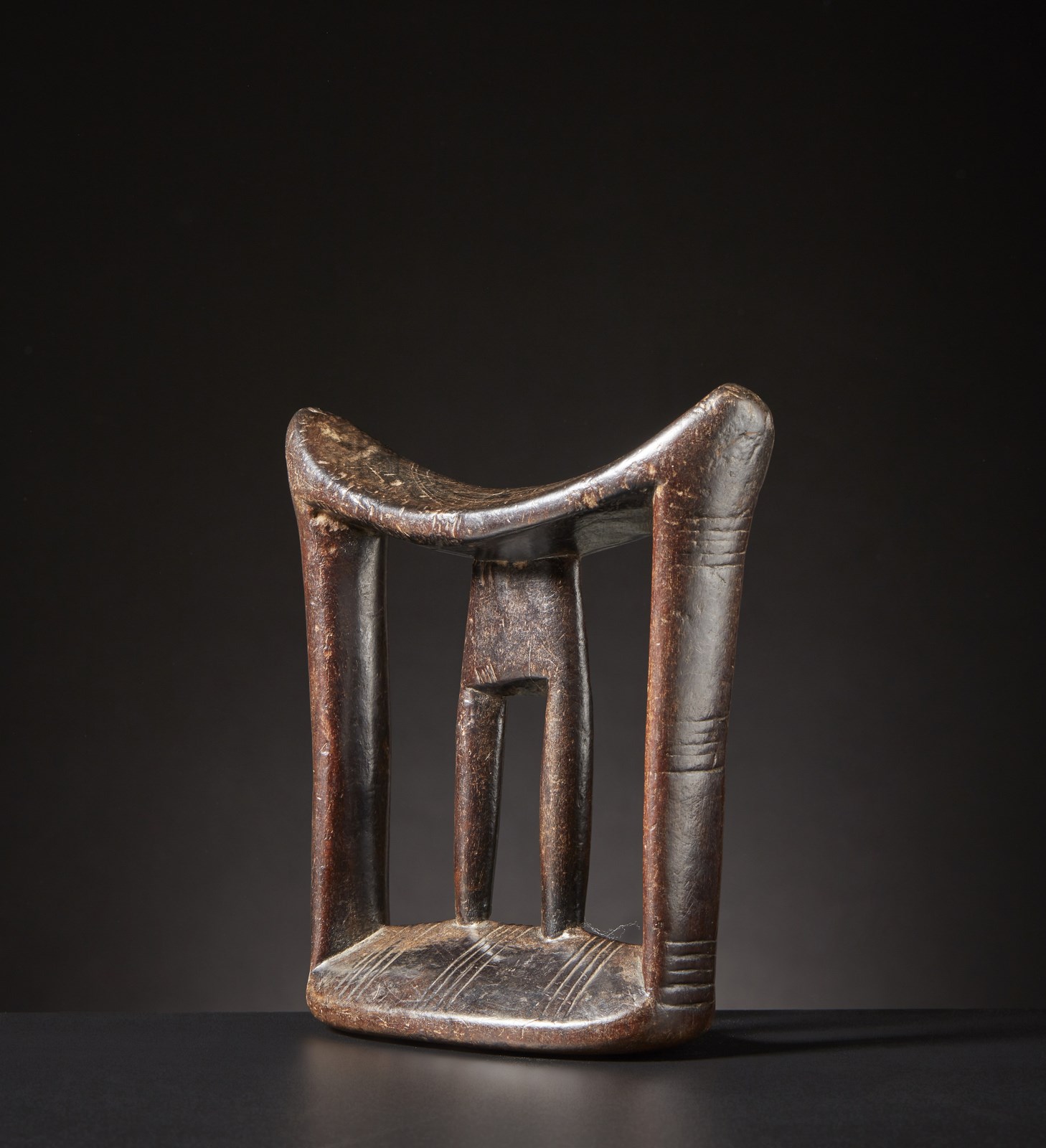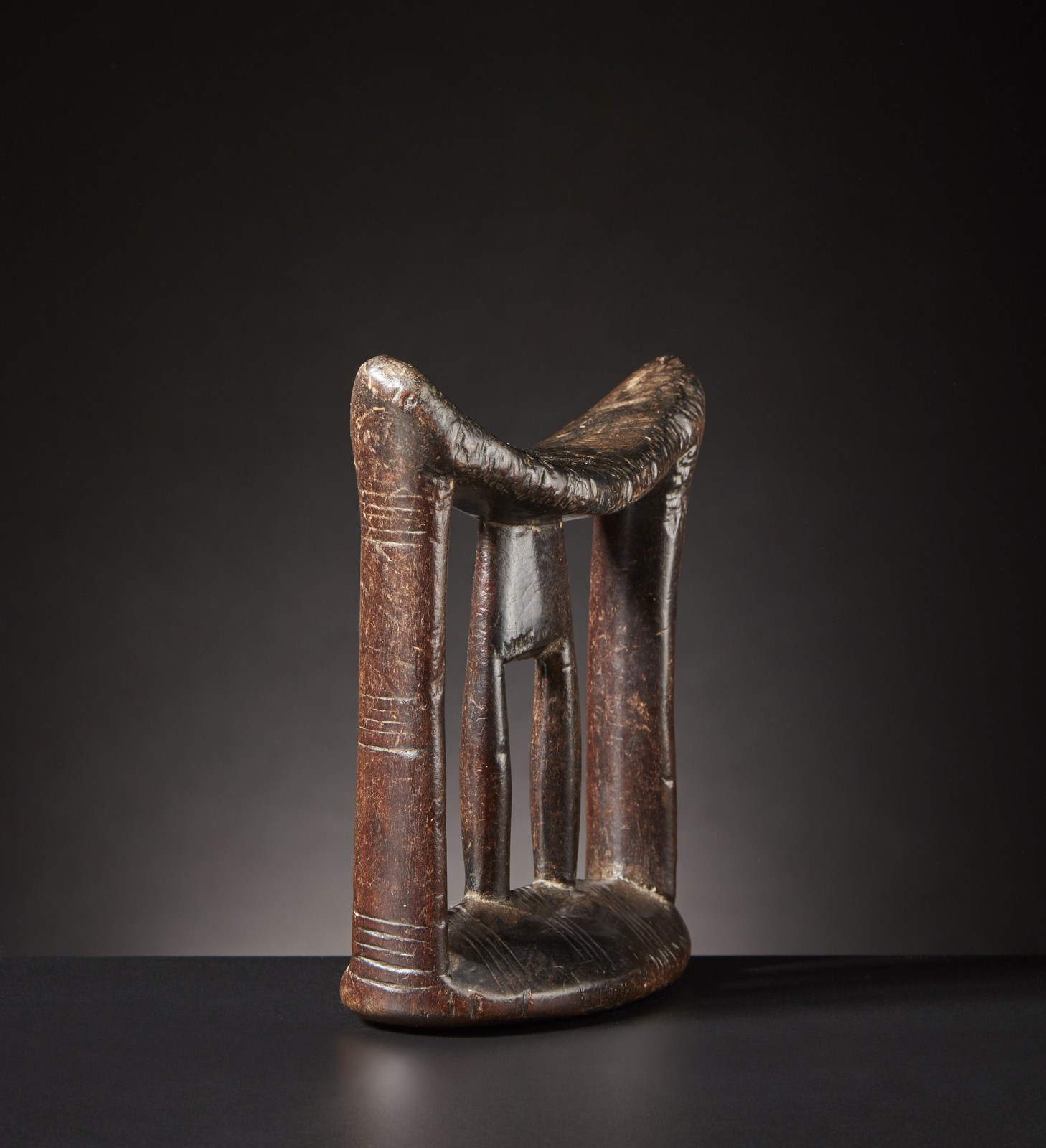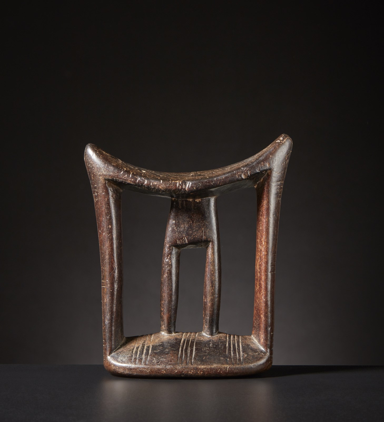 Poggiatesta.Legno duro a patina scura.Segni d'uso.