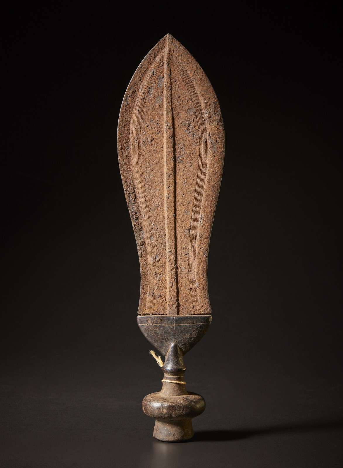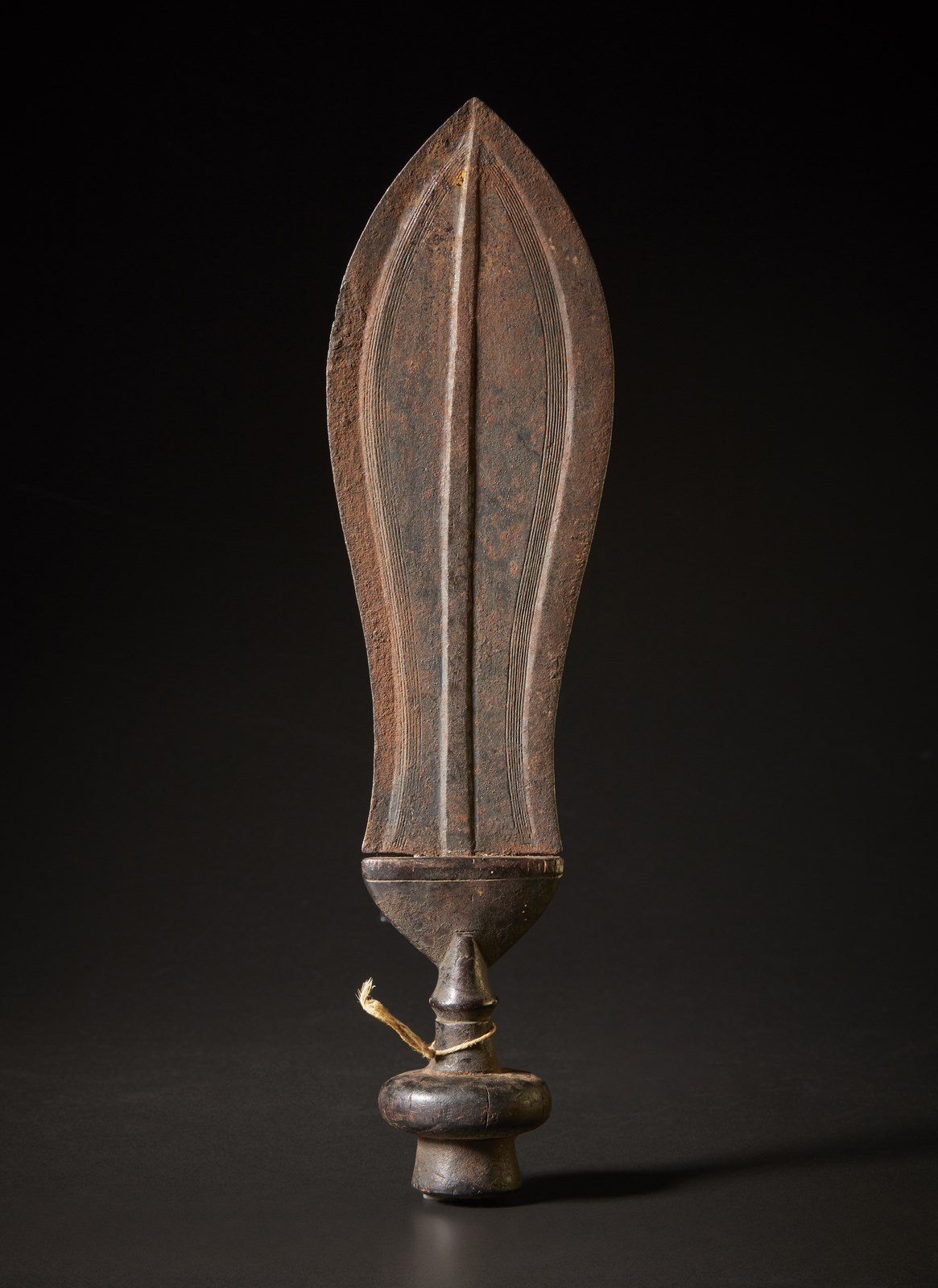 Lama larga in ferro con medio in rilievo e scanalature laterali che riprendono la curvatura del filo della lama non affilata. Manico in legno duro lavorato.Secondo la tradizione il pugnale cerimoniale Ikul sarebbe stato portato ai Kuba da Shyaam, fondatore del regno Kuba nel XVII secolo.Bella la patina sul legno del manico, mentre la lama non è stata particolarmente curata e presenta tracce di ruggine.