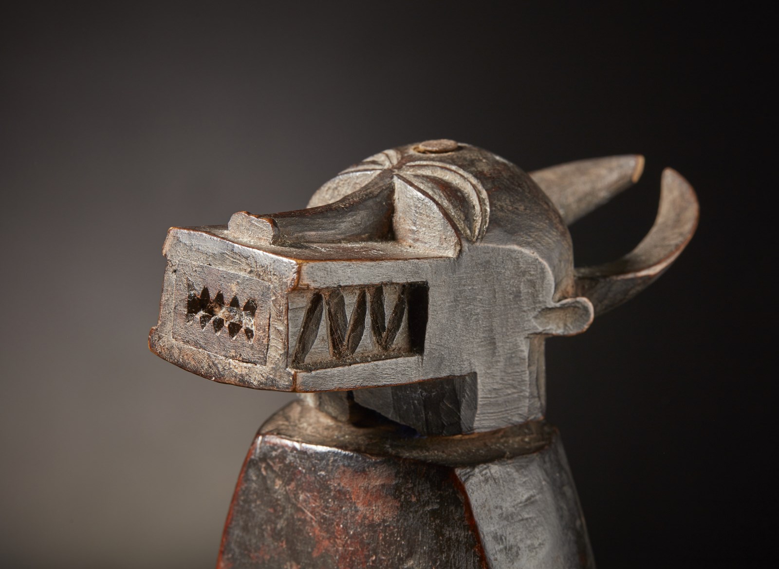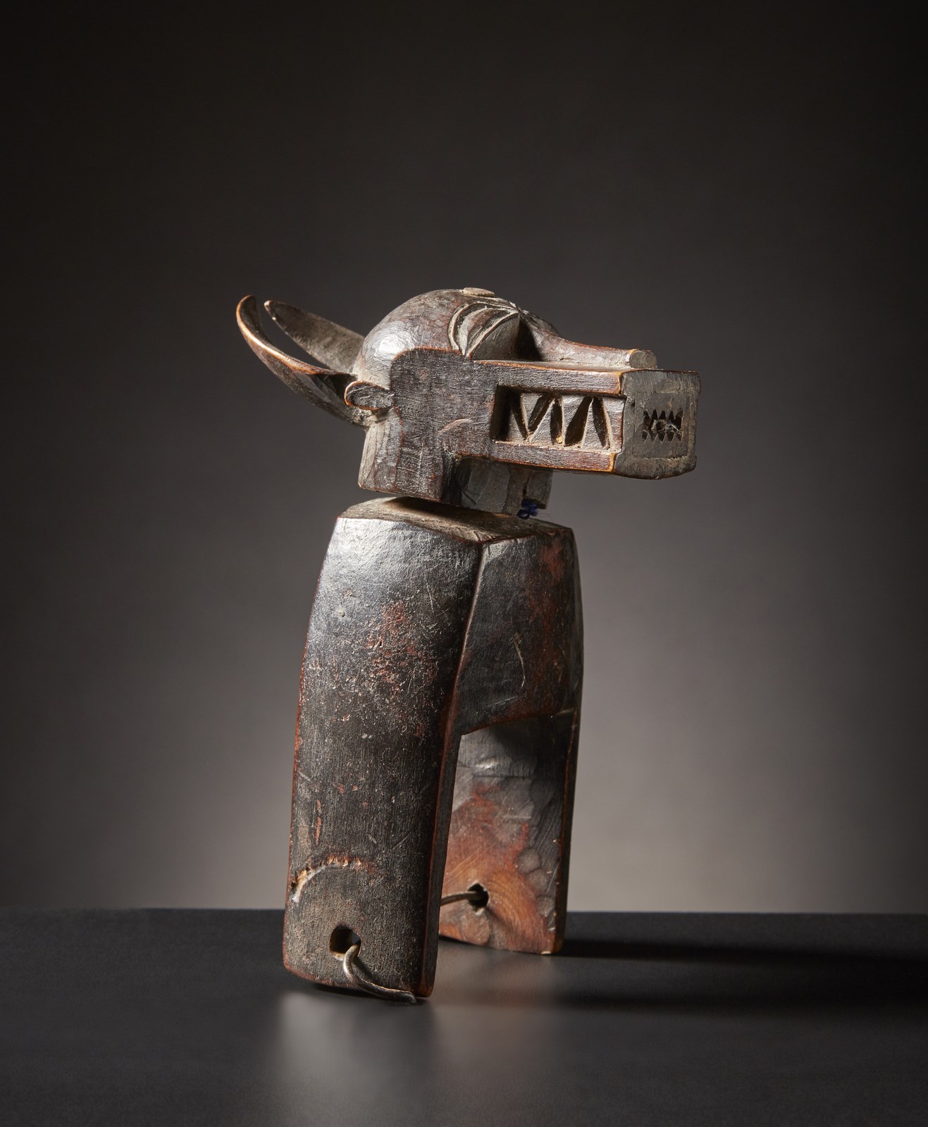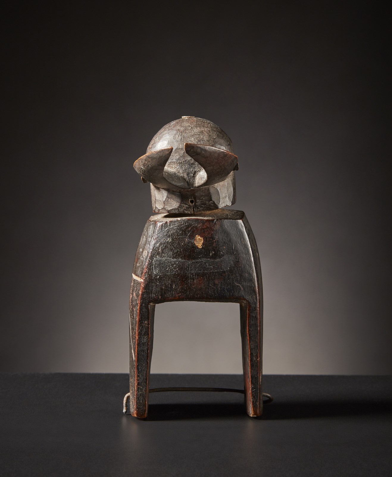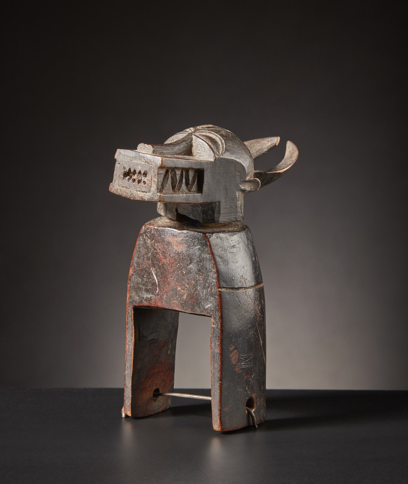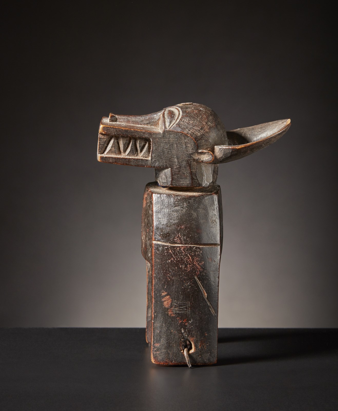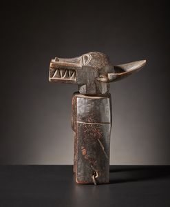Bella puleggia da telaio ornata da figura zoomorfa wanyugo o maschera sputafuoco.La testa dell'animale tipico della scultura Senufo si presenta rotante e fissato con un chiodo. Difficile dire se sia nato cosi o''sposato'' successivamente.Bella patina scura e segni d'uso.