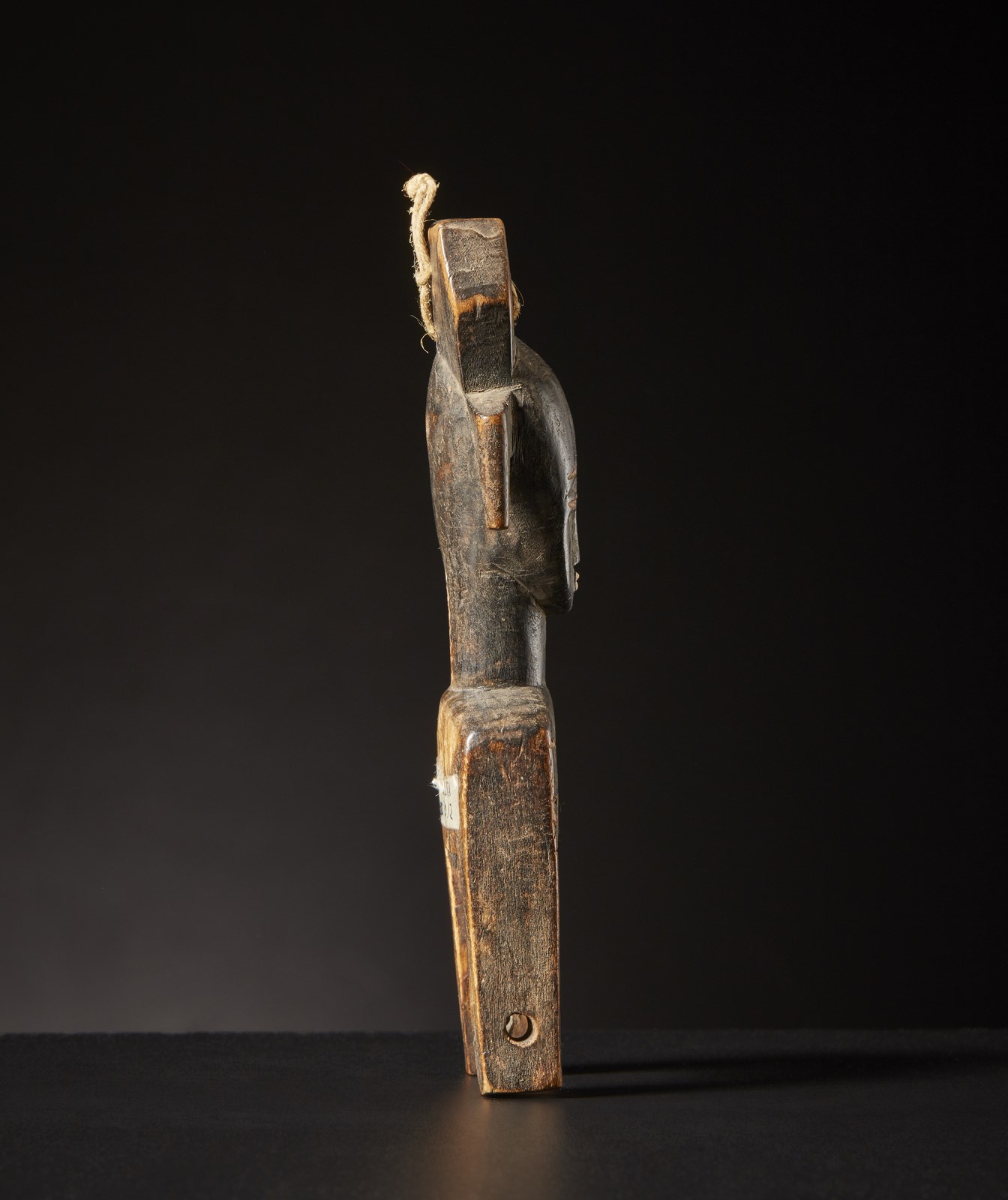Puleggia da telaio per tessitura ornata da testa antropomorfa con tratti dolci e aggraziati.Piccola etichetta di collezione.