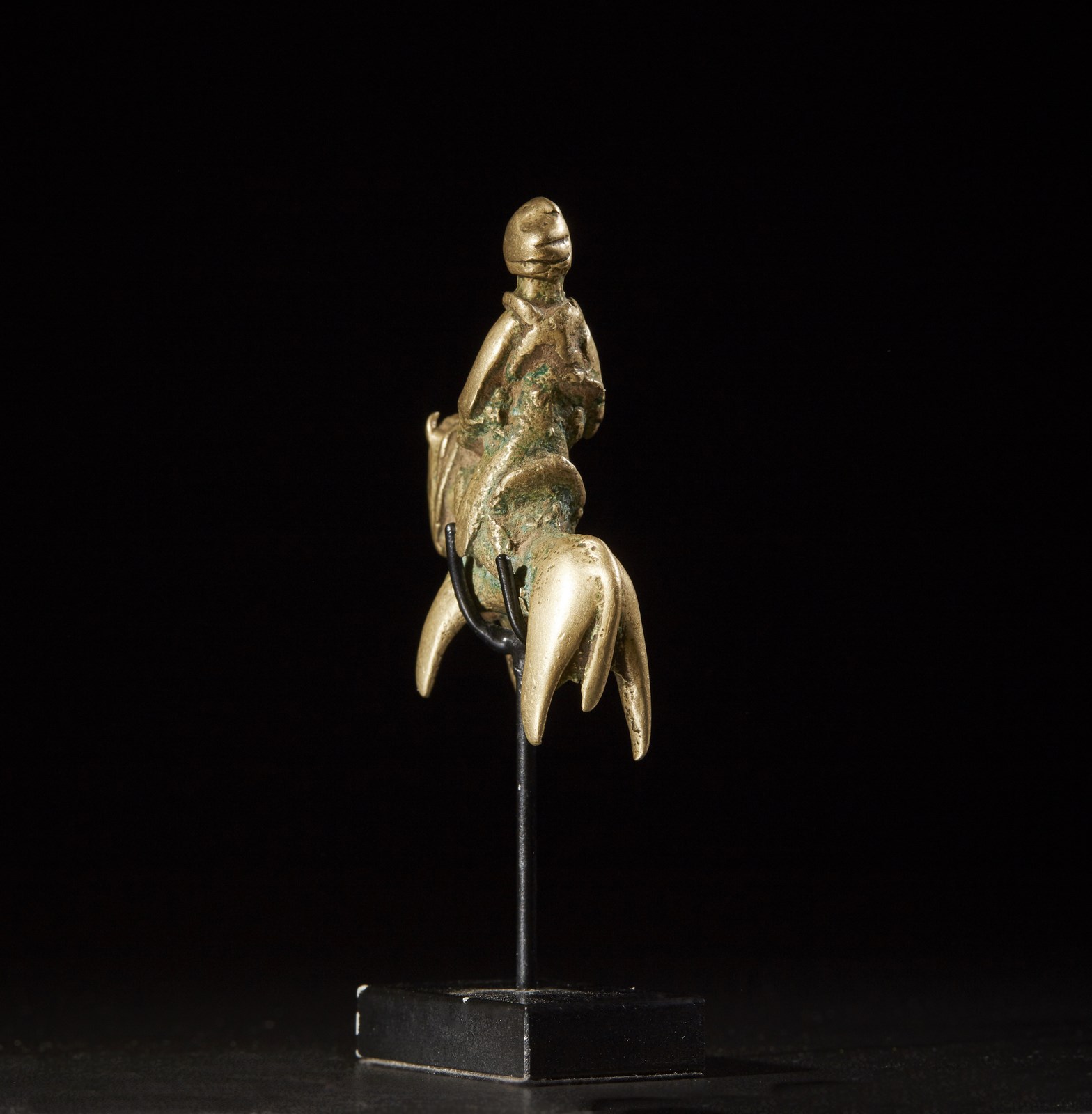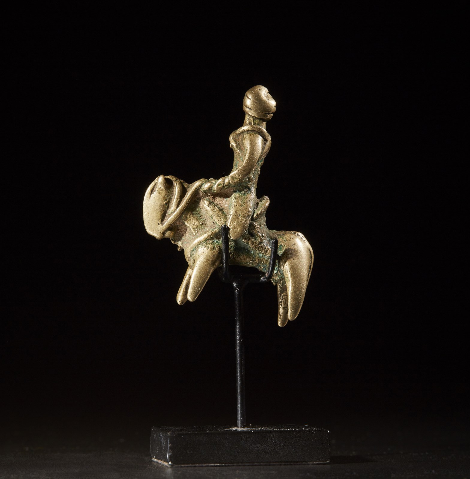 Piccola scultura in lega di bronzo realizzata in fusione a cera persa a forma di figura equestre con cavallo e cavaliere, utilizzata come talismano terapeutico dai Kotoko contro la follia e la possessione.Chiamati anche ''cavalieri contro la follia'', venivano affidati al malato che li portava sempre con se, ogni giorno e per tutto il tempo necessario, solitamente custoditi in un involucro di cuoio.Tante teorie e leggende accompagnano la storia di queste piccole e meravigliose sculture solitamente collezionate per il loro alto valore estetico. Per averne un'idea o per approfondire questo affascinante argomento potete consultare le oltre 500 pagine del volume ''Puchu Guinadji - Cavalieri contro la follia'' del 2011 scritto da Pierluigi Peroni attingendo dalla sua vasta cultura ed immensa collezione.