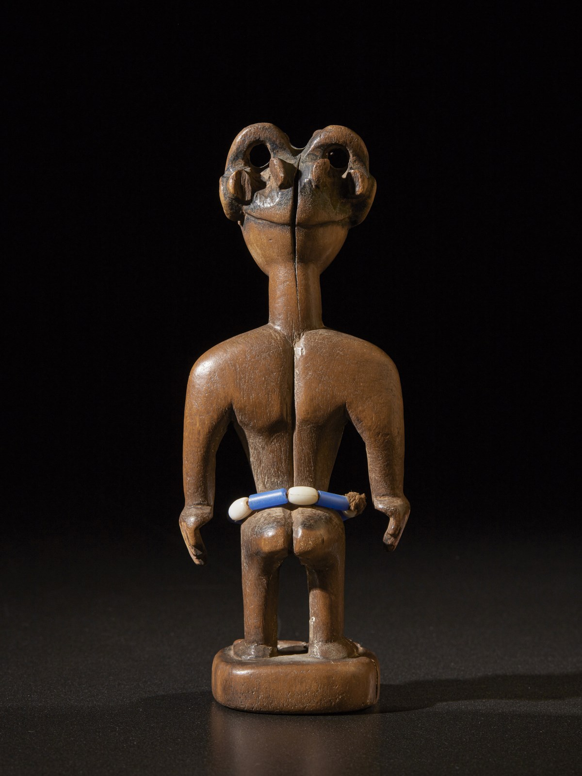 Piccola deliziosa scultura femminile di antenata, o forse bambola di fertilità, caratterizzata da un'elaborata acconciatura, scarificazioni sul raffinato volto particolarmente usurato e, purtroppo dalla mancanza del seno sinistro. Non sappiamo se tale mancanza sia dovuta ad una rottura accidentale o volutamente creata per riprodurre uno specifico tratto distintivo fisico di una persona cara, ma resta una preziosa testimonianza del valore estetico ed artistico della scultura Ewe.
