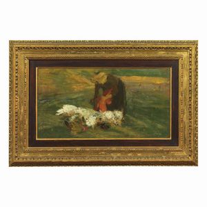 Tito Pellicciotti (Barisciano 1871 - Barisciano 1950) BAMBINO E PECORELLE olio su tela, cm 18x27 CHILD AND SHEEP [..]