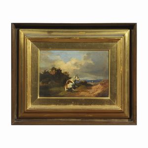 Scuola napoletana, sec. XIX PAESAGGIO CON MUCCA A RIPOSO olio su tela, cm 20x29 Neapolitan school, 19th century [..]