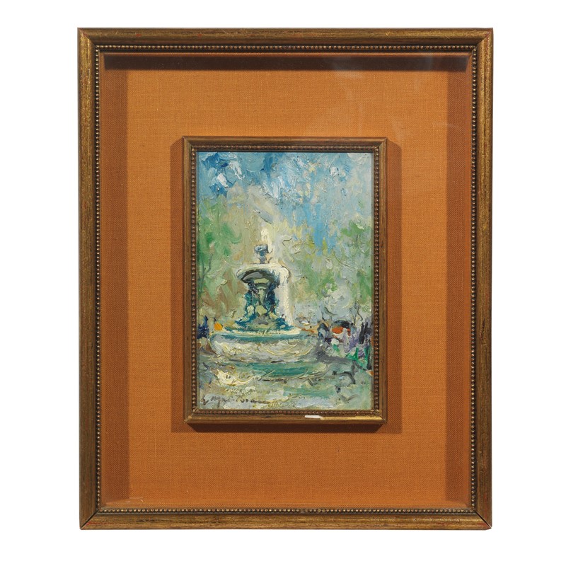 Luigi Mantovani (Milano 1880 - Milano 1957) PIAZZA FONTANA olio su compensato, cm 18x12 firmato in basso a sinistra retro del supporto: iscritto Mantovani / Piazza Fontana