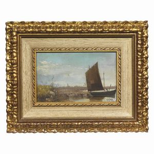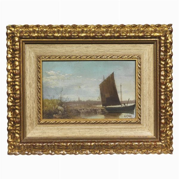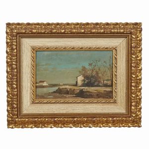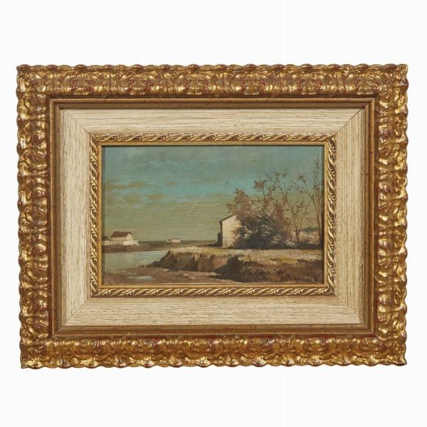 Scuola veneta, sec. XIX PAESAGGIO LACUSTRE PAESAGGIO FLUVIALE coppia di dipinti a olio su tavola, cm 11,5x18,5 il primo recante firma apocrifa G. Ciardi in basso a destra