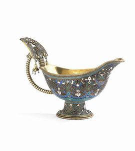 KOVSH, SAN PIETROBURGO, FINE SECOLO XIX, ARGENTIERE MICHAIL GRATSCHEW in argento dotato riccamente rivestito in [..]