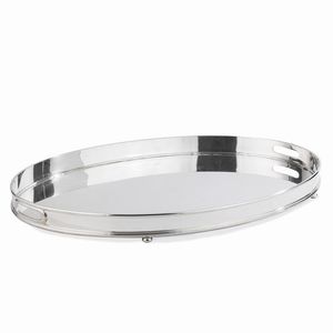 GUANTIERA, SECOLO XX in argento, di forma ovale poggiante su quattro piedini a sfera schiacciata, cm 52x38, g [..]