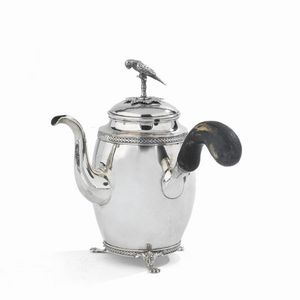 CAFFETTIERA, STOCCOLMA, 1815, ARGENTIERE JOHAN PETTER GRONVALL in argento, tre piedini a zampa ferina, corpo cilindrico [..]
