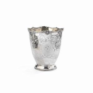 SECCHIELLO PORTA BOTTIGLIE, SECOLO XX in argento inciso e cesellato a fiori, foglie e mascheroni, alt. cm 23,5,g [..]