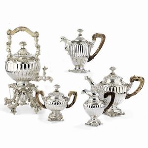 SERVIZIO DA TÈ E CAFFÈ, SECOLO XX in argento composto di samovar, teiera, caffettiera, lattiera [..]