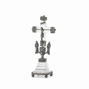 PICCOLA CROCE, SECOLO XVIII in cristallo di rocca e argento, base piramidale, Crocefisso affiancato dai dolenti, [..]