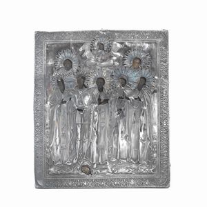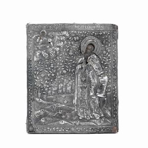ICONA, SAN PIETROBURGO, 1829, SAGGIATORE MIKHAIL MIKHAILOVICH KARPINSKY riza in argento sbalzato, olio su tavola [..]