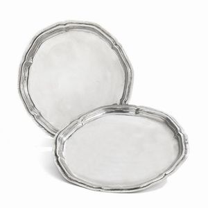 COPPIA DI VASSOI IN STILE SETTECENTO in argento, di forma circolare sagomata, diam. cm 28,5, complessivi g 1045. [..]