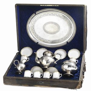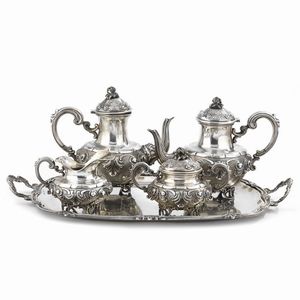 SERVIZIO DA TÈ, FINE SECOLO XIX, INIZI SECOLO XX in argento, composto di vassoio, caffettiera, lattiera [..]