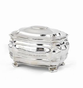 COFANETTO, GERMANIA, 1920 CIRCA, ARGENTIERE WAGNER & SON in argento di forma rettangolare sagomata, frone [..]