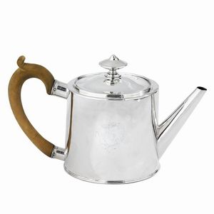 PICCOLA TEIERA, LONDRA, 1772, ARGENTIERE ANDREW FOGELBERG in argento, corpo liscio cilindrico, fronte con stemma [..]