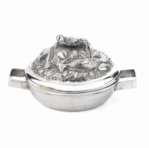 ZUPPIERA, FIRENZE, 1970 CIRCA in argento di forma circolare con anse geometriche, coperchio riccamente sbalzato [..]