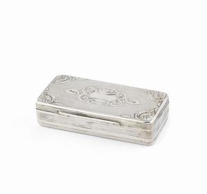 TABACCHIERA, SECOLO XIX in argento, di forma rettangolare, coperchio guillochè con riserva di volute al [..]