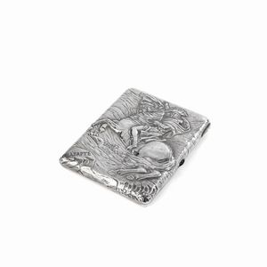 PORTASIGARETTE, MOSCA, INIZI SECOLO XX, ARGENTIERE SERGIEV KLIM in argento, coperchio sbalzato con raffigurazione [..]