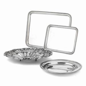 TRE VASSOI, PADOVA, SECOLO XX in argento, due di forma rettangolare e uno di forma circolare con profili a foglie [..]