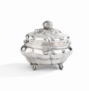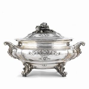 ZUPPIERA, SECOLO XX in stile Settecento, in argento, quattro piedini a grandi volute di foglie, corpo ovale decorato [..]