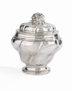 ZUCCHERIERA, TORINO, SECOLO XVIII in argento sbalzato a motivi obliqui, finale del coperchio realizzato come una [..]
