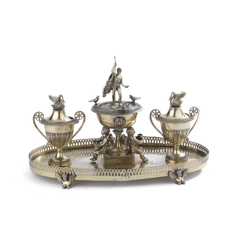 in argento dorato, base ovale su quattro piedini in forma di figure femminili alate, bordo a ringhierina, al centro tre coppette, due in forma ovoidale a due anse con coperchi le cui prese sono realizzate a cigni, la terza realizzata come una grande coppa alla cui base sono sedutu due putti alati e sul cui bordo si abbeverano colombi, la figura di Nettuno con tritone sul mare realizza il coperchio, cm 28x17x15, g 805
