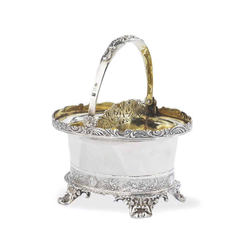 in argento di forma ovale poggiante su quattro piedini a volute, base decorata da fascia a tralci vegetali e medaglioni, profilo analogamente decorato, interno a due alloggi, cm 14,5x11,5x17, g 410
