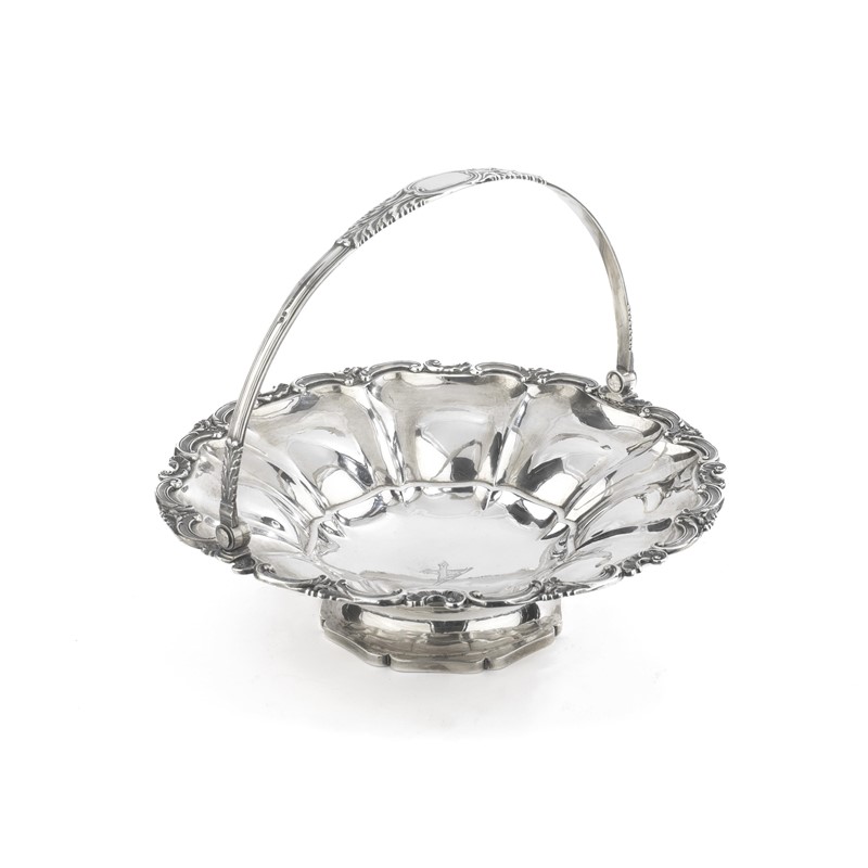 in argento, ampia tesa sbalzata e profilata da volute, diam. cm 30, g 1020