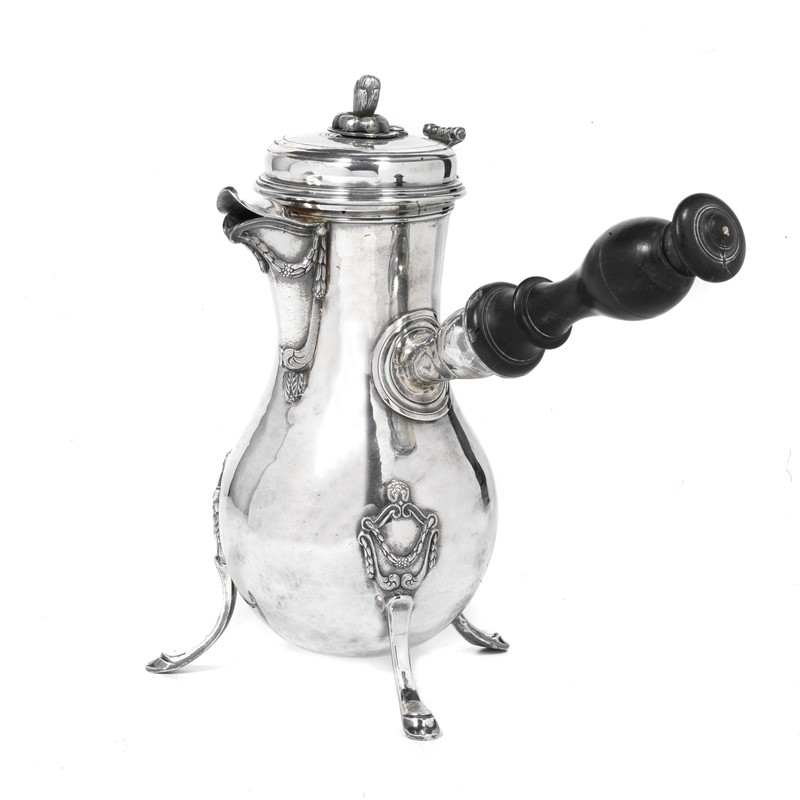 in argento, corpo piriforme su tre alti piedini terminanti a zoccolo euino, beccuccio ornato da festoni di foglie, presa dritta, coperchio con finale a bocciolo, alt. cm 21,5, g 640