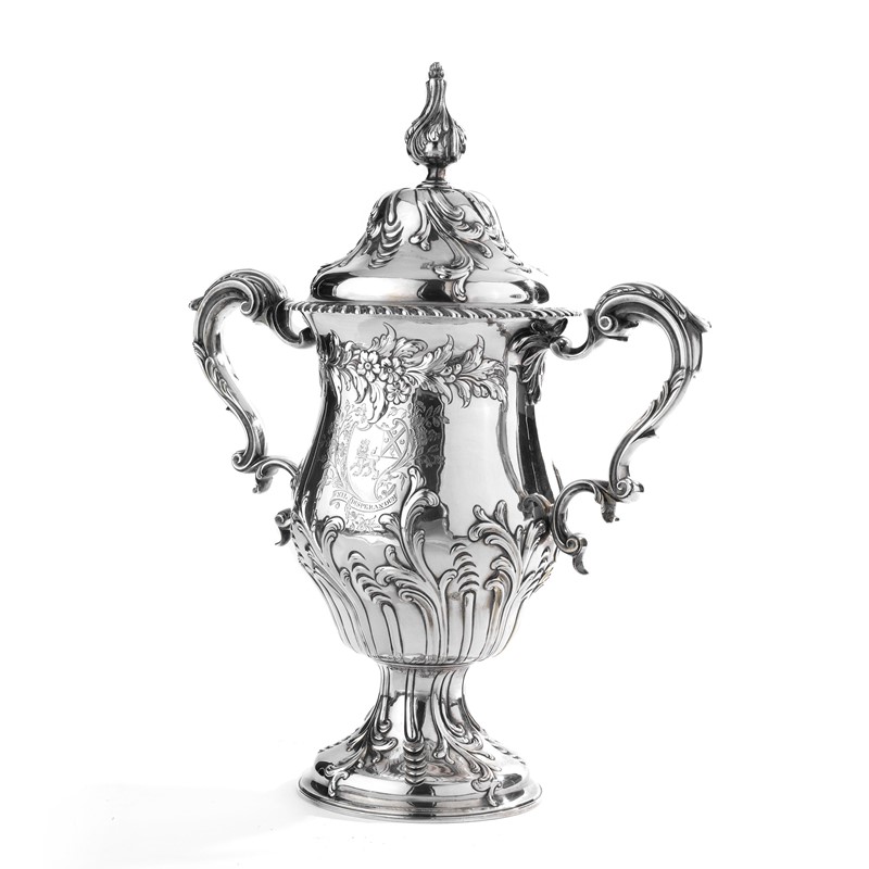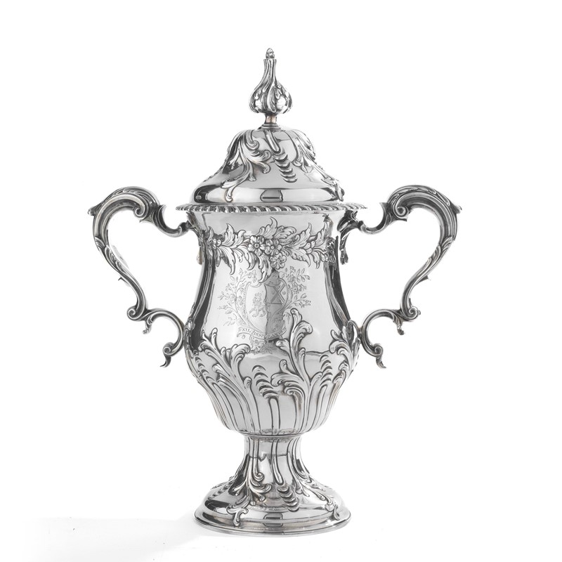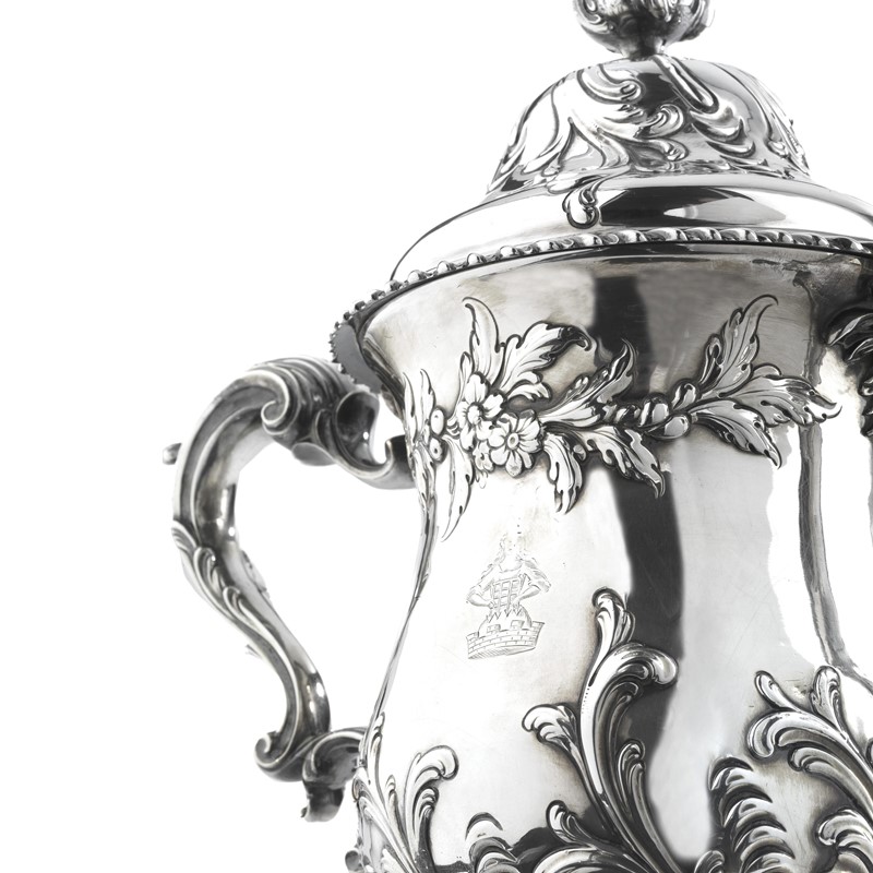 in argento, base circolare lievemente bombata su cui poggia la coppa sagomata decorata da foglie e festoni di fiori in rilievo, fronte con stamma nobiliare incisio completo di cartiglio iscritto NIL DISPERANDUM, due anse a volute, cperchio pcon presa piriforme, alt. cm 42, g 1875