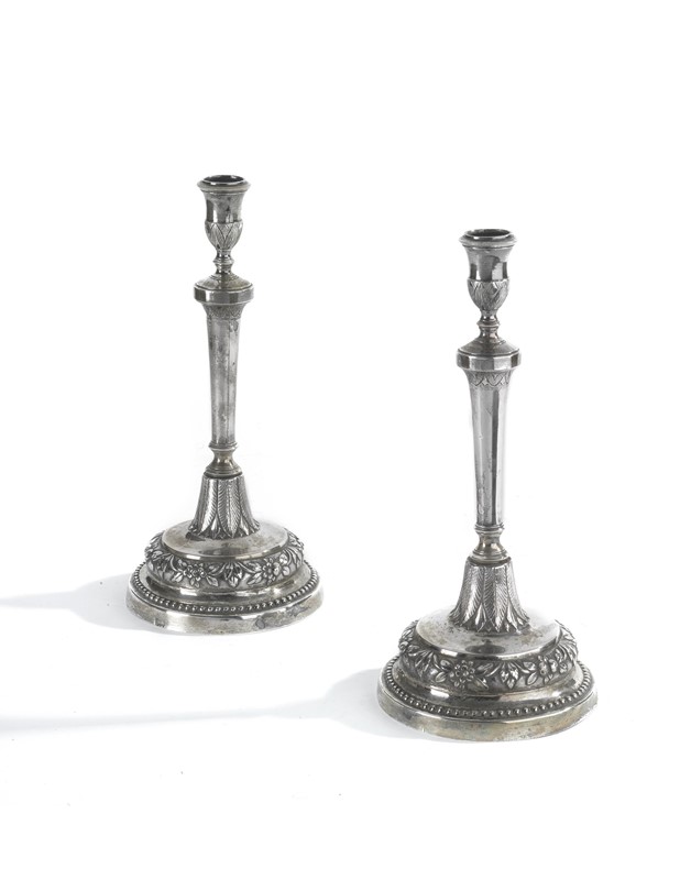 in argento, basi gradinate con profili perlinati e sbalzati a festoni di fiori, fusti rastremati, alt. cm 28, complessivi g 754