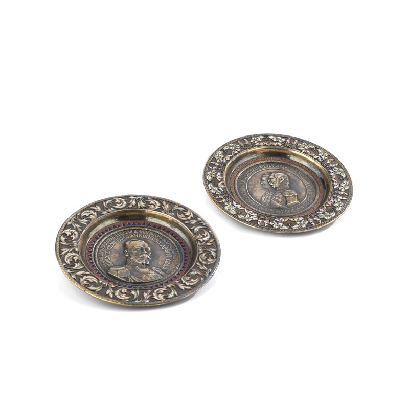 in argento, al centro raffigurazioni degli zar di Russia con iscrizioni in cirillico, tese decorate da volute di foglie in smalto, diam. cm 12,5, complessivi g 385