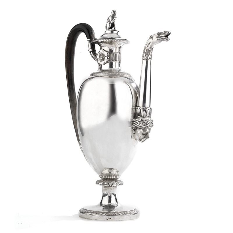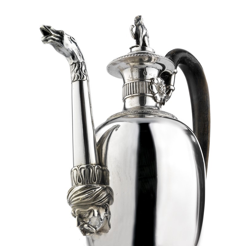in argento, base ovale con profilo a foglie lanceolate, corpo ovoidale, presa in legno unita al collo da foglie e fiori in rilievo, beccuccio con finale zoomorfo unito al corpo con volto di arabo in rilievo, finale del coperchio realizzato come una scimmia seduta, alt. cm 39, g 1330