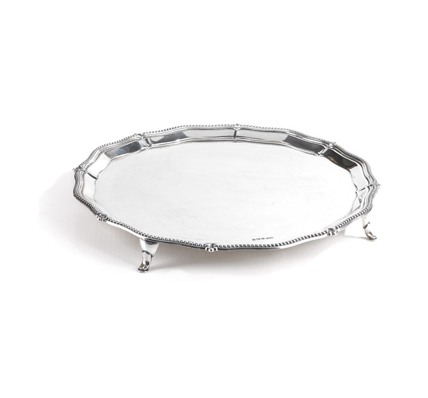 in argento di forma circolare sagomata con profilo perlinato, quattro piedini a zoccolo equino stilizzato, diam. cm 42, g 1870