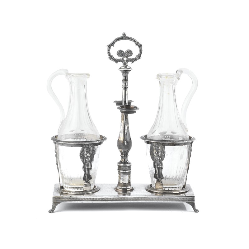 in argento, base rettangolare profilata da palmette, porta ampolle realizzati con tre sostegni realizzati a figure femminili alate, fusto a balaustro, presa a doppia voluta, alt. cm 27, g 580, completa di ampolle di cui una con tappo rotto