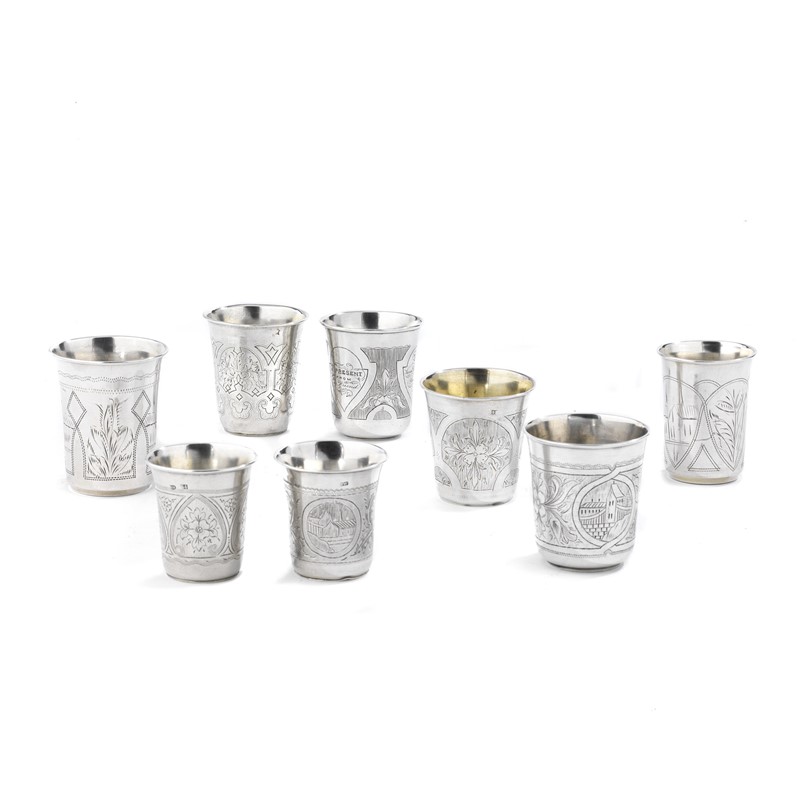 in argento, due della città di Kiev, decorati da fiori e architetture incisi, alt. cm 7,5 e cm 7; sei della città di Mosca, 1868, 1873, 1875, 1877, decorati da riserve di foglie, architetture e incisioni in cirillico, alt. cm 6 e cm 7, complessivi g 390