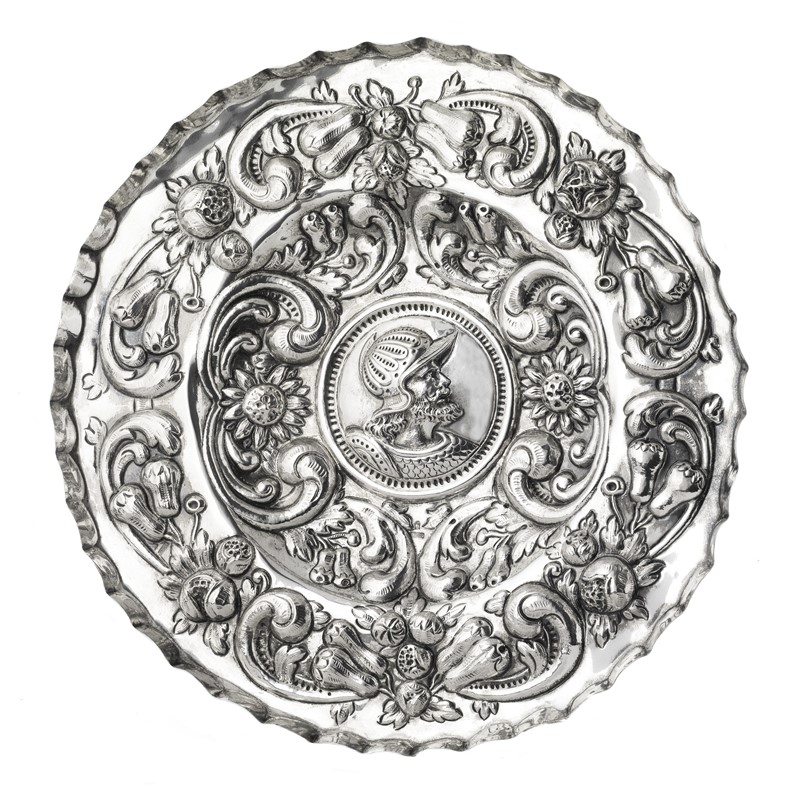 in argento sbalzato a motivi vegetali, cavetto con profilo virile con elmo, diam. cm 51