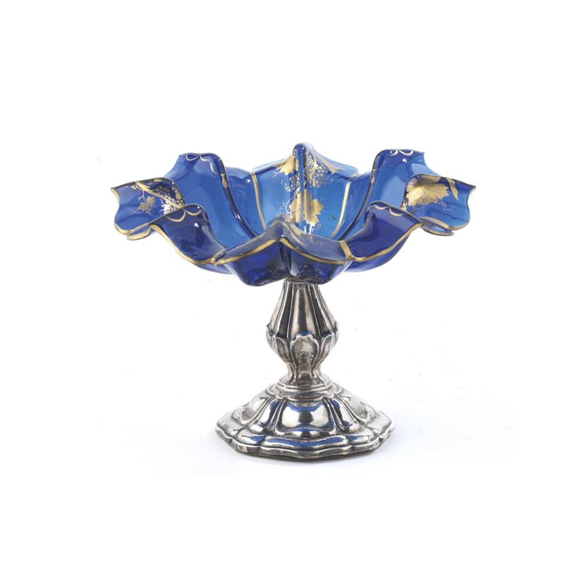 in argento, base sagomata e fusto a balaustro, piattello in vetro blu decorato a viticci in oro, alt. cm 13,5, diam. cm 19. Base appesantita