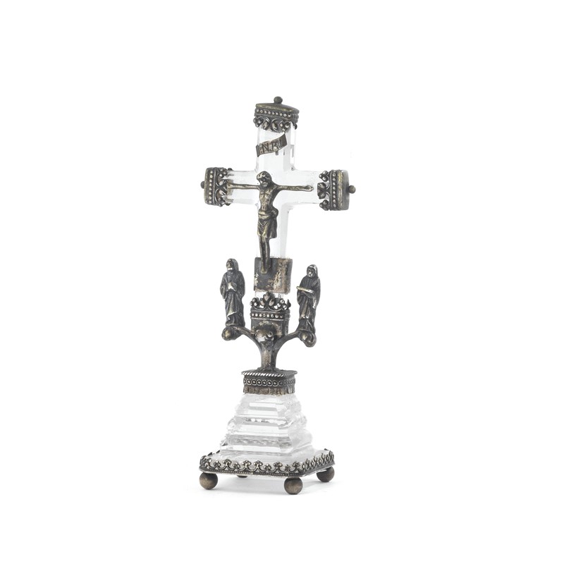 in cristallo di rocca e argento, base piramidale, Crocefisso affiancato dai dolenti, cm 12,5x5