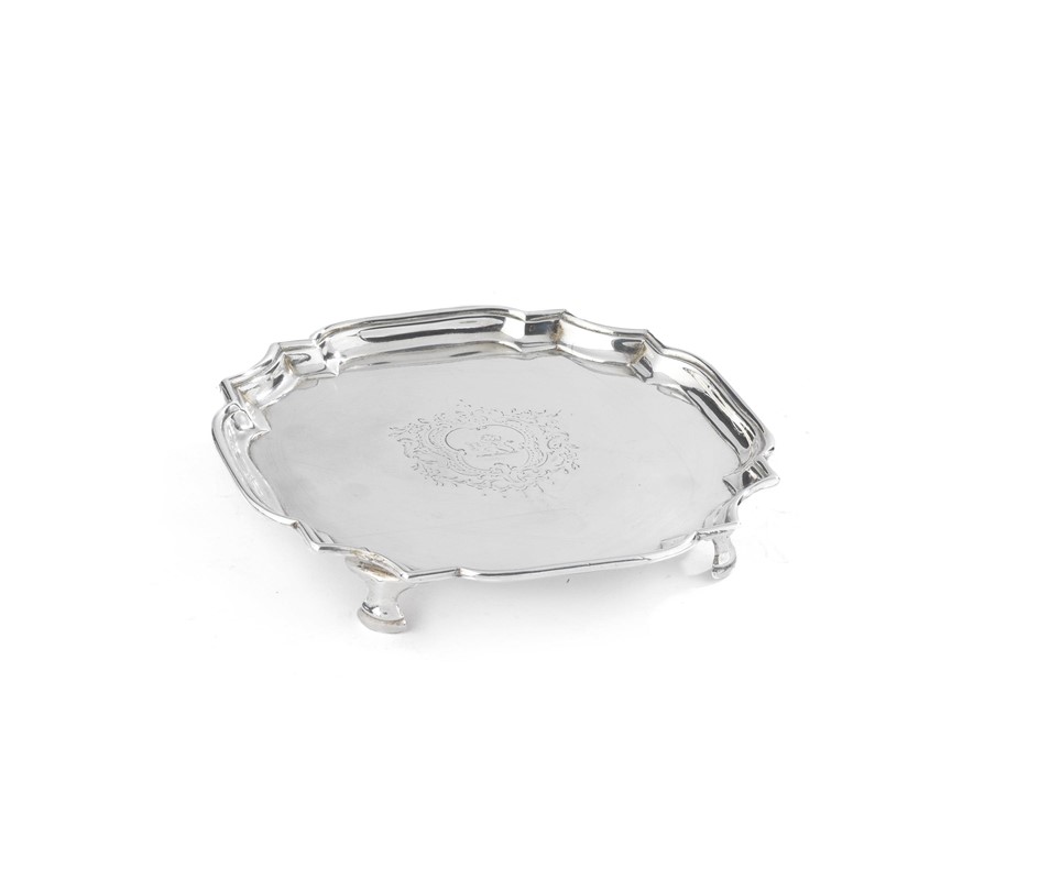 in argento di forma quadrata sagomata, al centro stemma inciso, cm 14,5x14,5, g 215