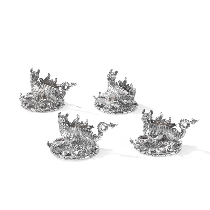 QUATTRO DRAGHI, LONDRA, 1844, ARGENTIERE ROBERT GARRARD II in argento finemente cesellato e sbalzato a raffigurare draghi su elementi vegetali, alt. cm 6, complessivi g 885 Sul fondo recano due fori che fanno pensare si trattasse di finali per coperchi.
