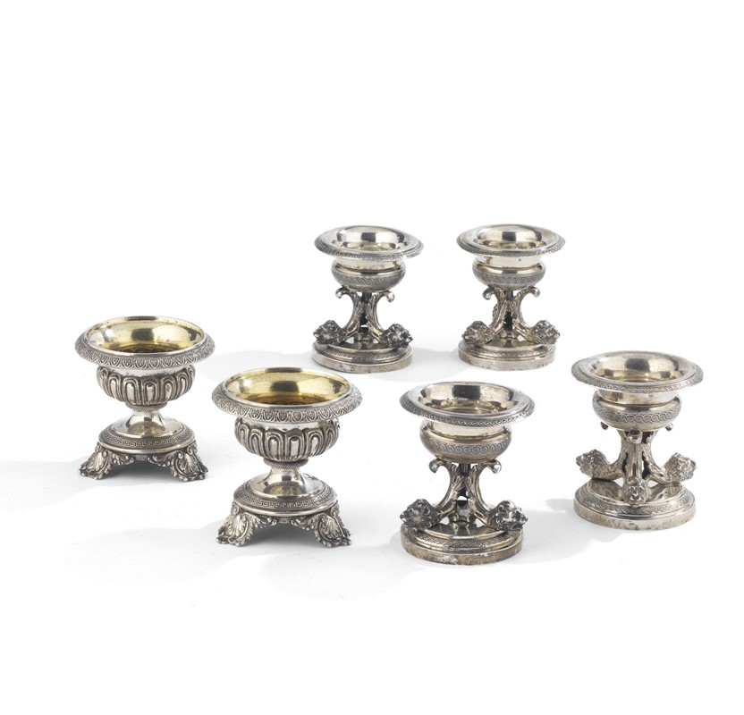 in argento, le prime quattro con sostegno a tripode poggiante su base circolare, le altre due poggianti su tre piedini cesellati a foglie, alt. cm 8,3 e cm 8, complessivi g 615