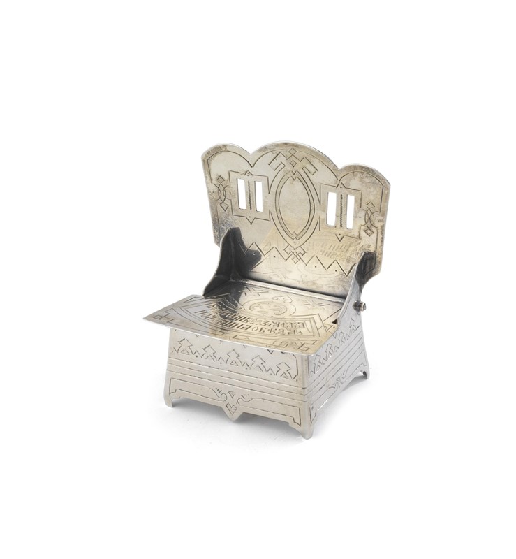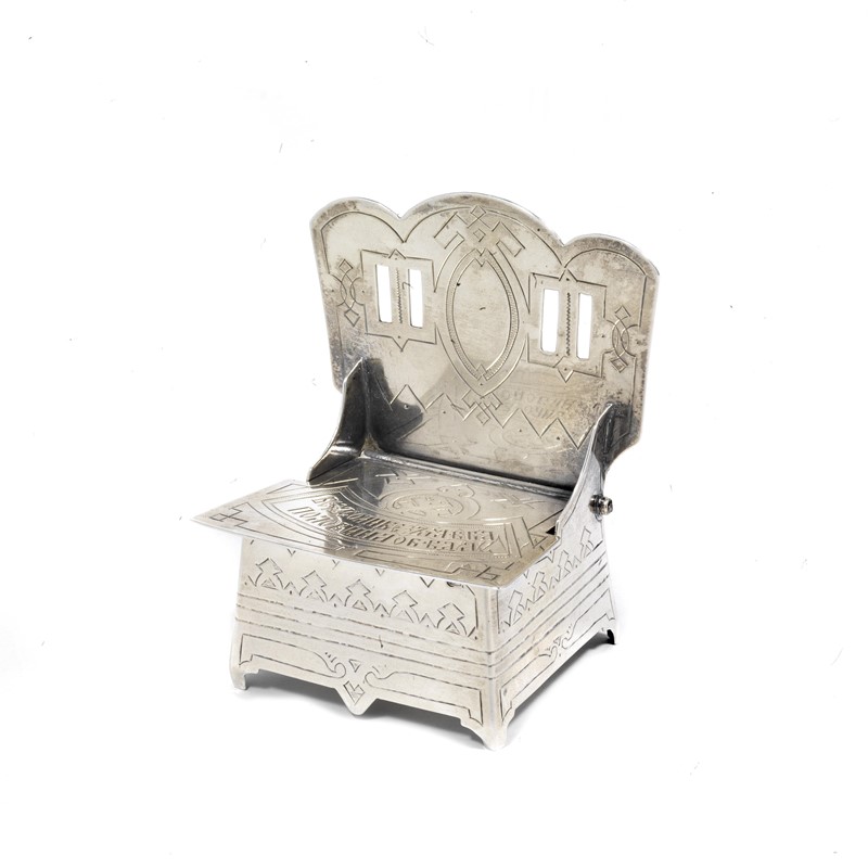 in argento, seduta decorata da incisione in cirillico, schienale sagomato e traforato, cm 5x4,3x7, g 76