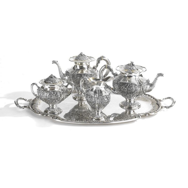 in argento composto di teiera, caffettiera, lattiera zuccheriera e guantiera riccamente sbalzate a colute fogliacee e rose, vassoio, cm 73x45, complessivi g 6555