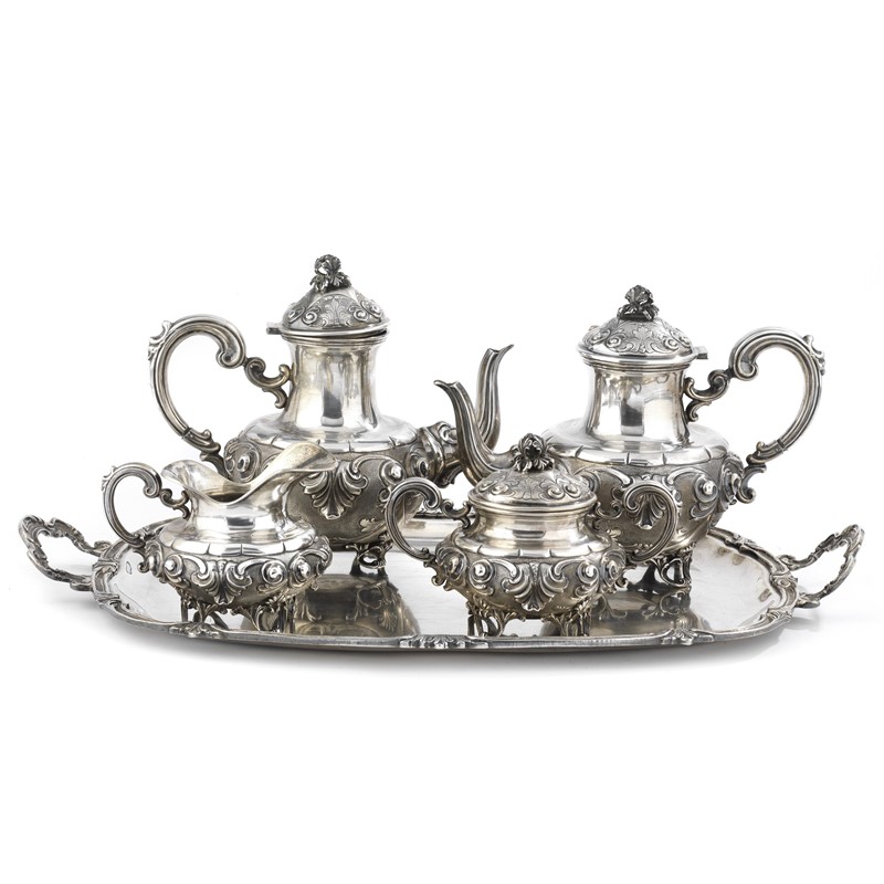 in argento sbalzato a volute di foglie, composto di teiera, caffettiera, lattiera, zuccheriera e guantiera, prese a doppia voluta, vassoio cm 58x35,5, complessivi g 4170