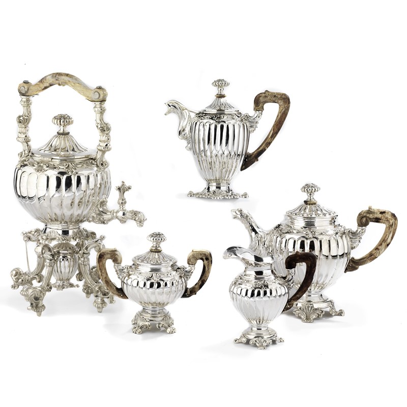 in argento composto di samovar, teiera, caffettiera, lattiera e zuccheriera con manici in legno, complessivi g 6575
