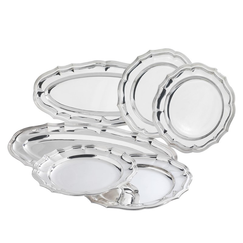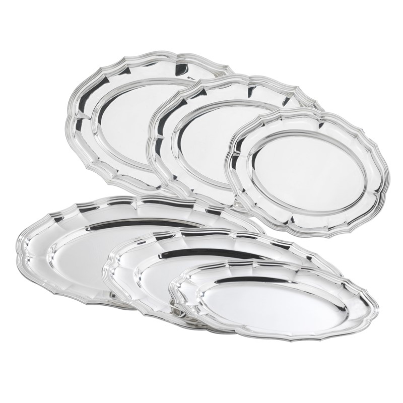 in argento, composto di due pesciere, cm 61x29; due vassoi ovali grandi, cm 49x35,5; due vassoi ovali medi, 45,5x32; due vassoi ovali piccoli, cm 39,5x27,5; due vassoi circolari grandi, diam. cm 37,5; due vassoi circolari medi, diam. cm 34; complessivi g 14945